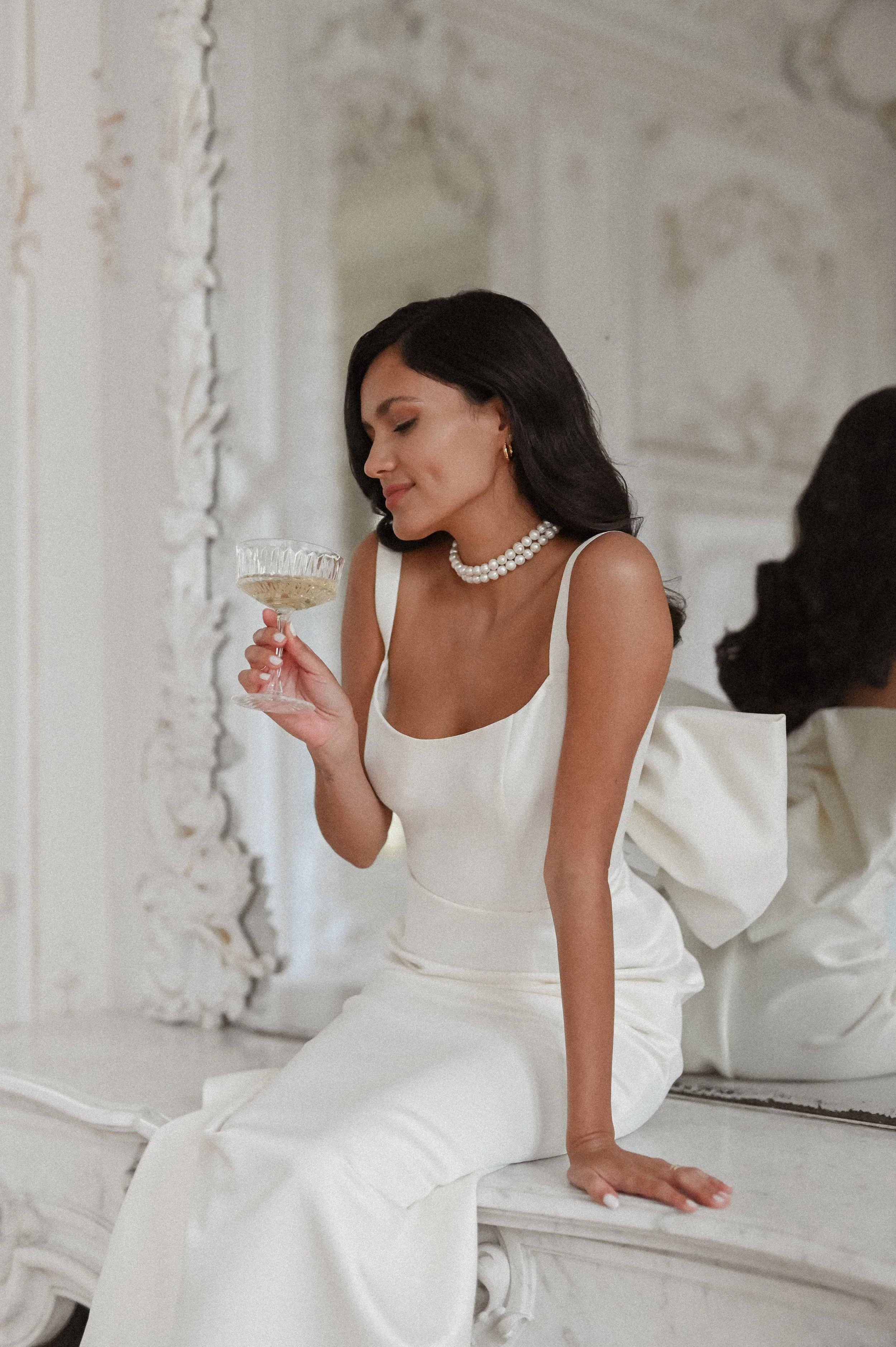 Pamela looked every bit the Hollywood starlet in her bespoke Zoe Rowyn Bridal gown by Twosoulsbridal, styled to perfection by the renowned Sinem Yavsaner. Her look was completed with Lamano jewelry and classic Manolo Blahnik heels, creating a timeless and sophisticated ensemble as she prepared to say "I do."